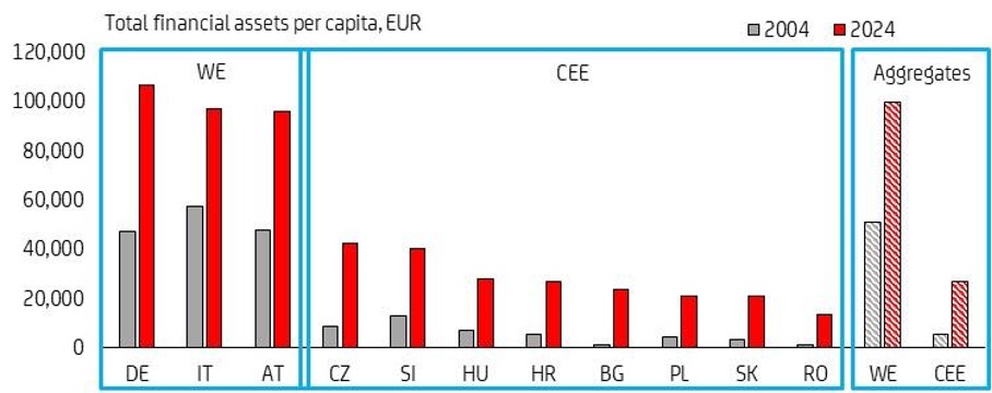 Badanie pokazuje, że finansowa zasobność gospodarstw domowych per capita wzrosła w ciągu ostatnich dwudziestu lat w CEE niemal pięciokrotnie, w miarę jak gospodarki regionu stopniowo zbliżały się do gospodarek Europy Zachodniej. Dla porównania, w krajach Europy Zachodniej, takich jak Niemcy, Włochy i Austria, odnotowano dwukrotny wzrost. „Niemniej jednak, finansowa zasobność per capita w CEE pozostaje na poziomie około 30% w stosunku do Europy Zachodniej, co sugeruje pole do znacznej dalszej konwergencji” – mówi Mauro Giorgio Marrano, Starszy Ekonomista ds. CEE i jeden z autorów.